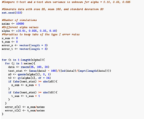 We can build a simple simulation to compare the type I error rates for the Z – test and t – test, and check whether the t – test performs better when the sample size is small and the variance is unknown. Just to recall, a type I error is rejecting a true null hypothesis.
