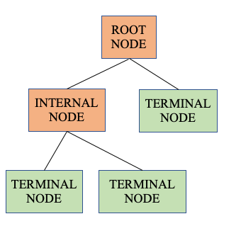 Though the tree in this animation is performing the task of classification, it helps to visualize how the predictor space is being divided into 4 non-overlapping regions using a decision tree (on the left). These 4 regions (on the right) are called the ‘terminal nodes’/ ‘leaves’ of the tree. The first point of the tree which splits the predictor space is called ‘root node’, but every such subsequent point is called an ‘internal node’. Hence, this tree has one root node, two internal nodes, and four terminal nodes.