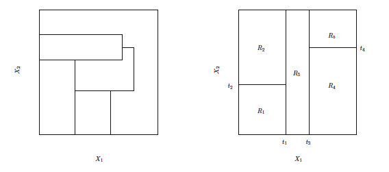 Thereafter, we look for the best predictor and the best cutpoint in order to split R1 or R2, so as to minimize the RSS in each of the resulting regions. This gives us three regions. Again we split one of the three regions using the predictor and cutpoint which minimizes the RSS in each of the resulting regions. We continue this process until our stopping criterion is reached.