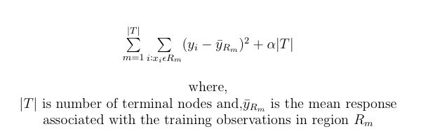 is minimized. When α = 0, the above formula only measures the training error and hence, the subtree T is simply T0. However, as α goes on increasing, there is a penalty for every additional terminal node, and as a result, the above equation will tend to be minimized for smaller trees. The best value for α can be selected using cross validation. Finally, we select the subtree corresponding to the chosen value of α.